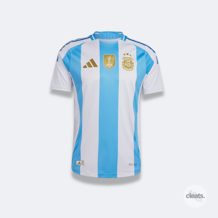 Strike a fresh new look to celebrate an epic legacy. Designed for pro players, the collection fuses high-tech features and bold design to bring a vibrant twist to the game. Introducing the iconic national symbols in a modern silhouette, the Argentina 2024 Home Authentic Jersey cheers the fiery enthusiasm that distinguishes La Albiceleste's fans. With the unmistakable white and blue setting the tone, this slim-fit jersey is crafted from a lightweight fabric that sits comfortably on your skin. Using advanced materials, adidas HEAT.RDY maximizes air flow so you can feel cool and fresh while embracing the energy of the crowds. This product is made with at least 70% recycled materials. By reusing materials that have already been created, we help to reduce waste and our reliance on finite resources.