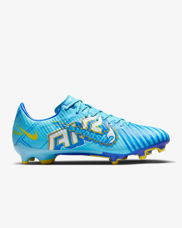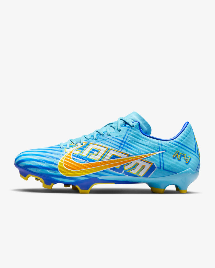 Kylian Mbappé's explosiveness, plus his twitchy change of direction, puts him firmly in the world class of finishers. With nods to his heritage, this boot is made to help you play just like KM—with blinding pace and purpose. We added a Zoom Air unit and grippy texture up top for exceptional touch, so you can dominate in the waning minutes of a match—when it matters most.